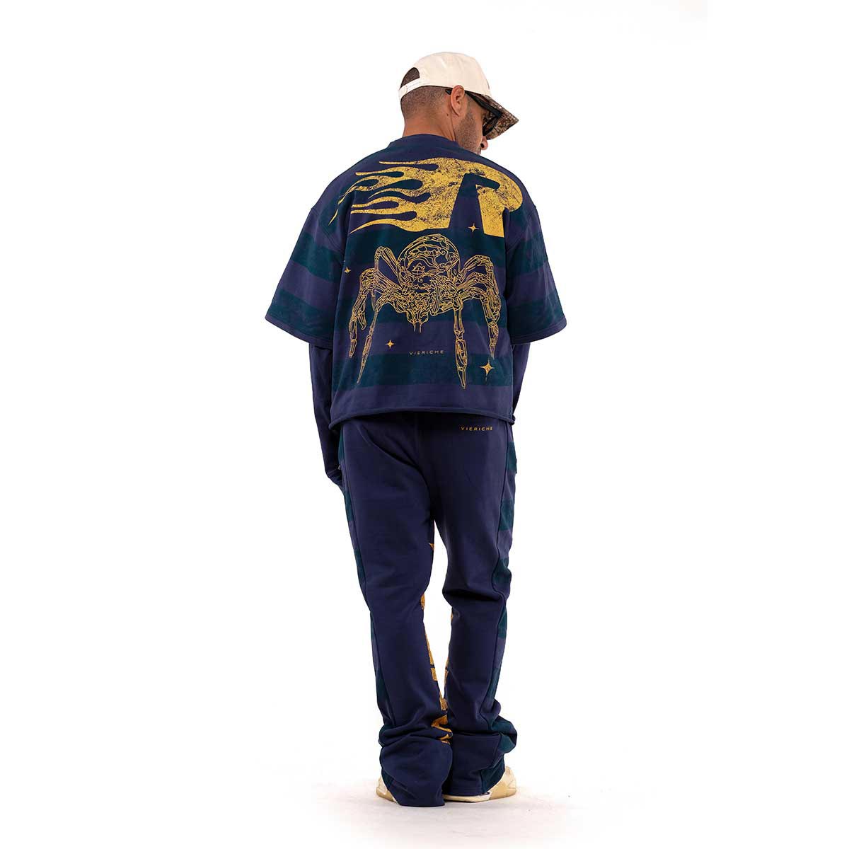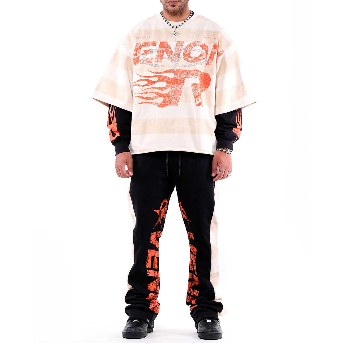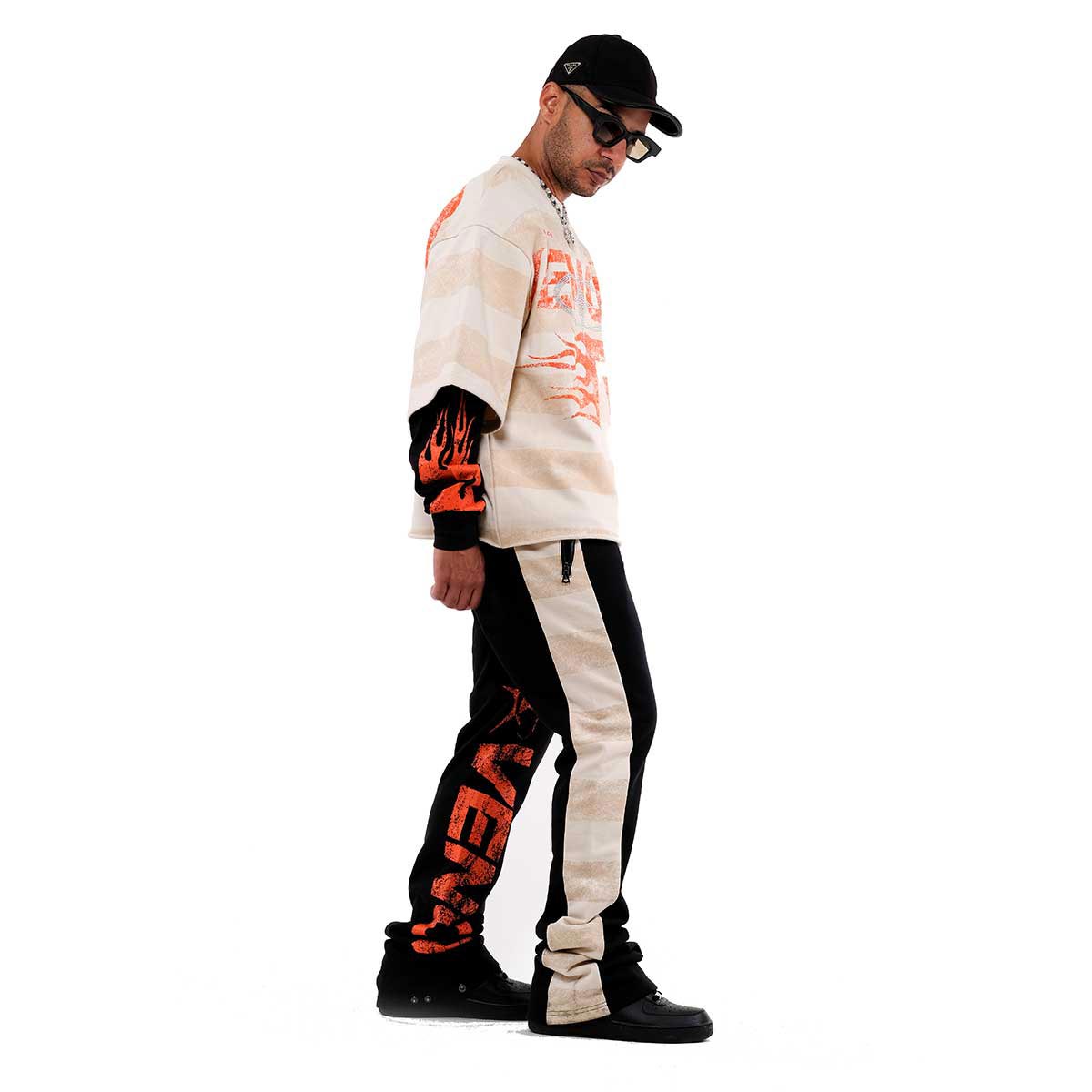 100% Heavyweight cotton french terry sweat pants with printed stripes, printed graphics, zippered pockets and drawcord puller.