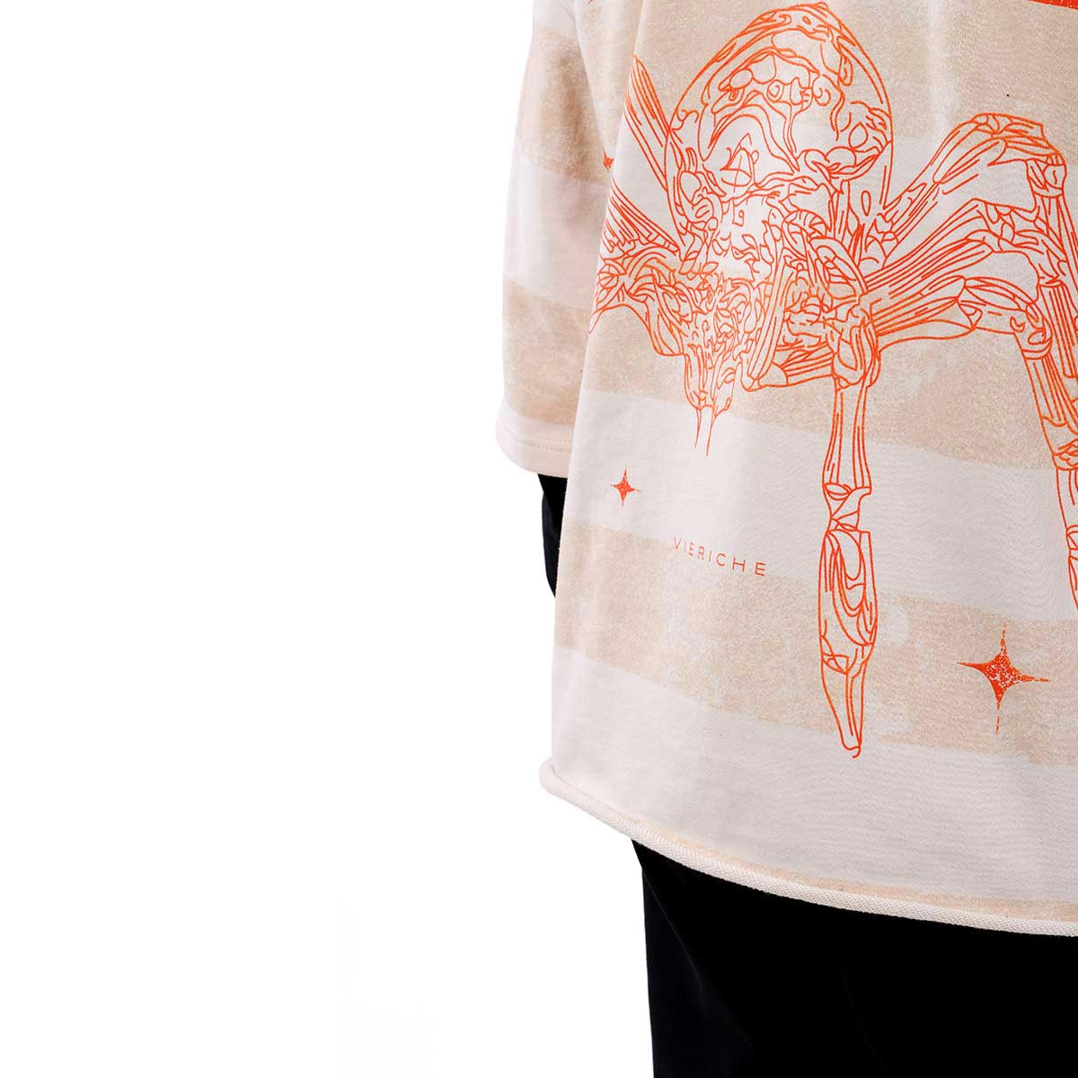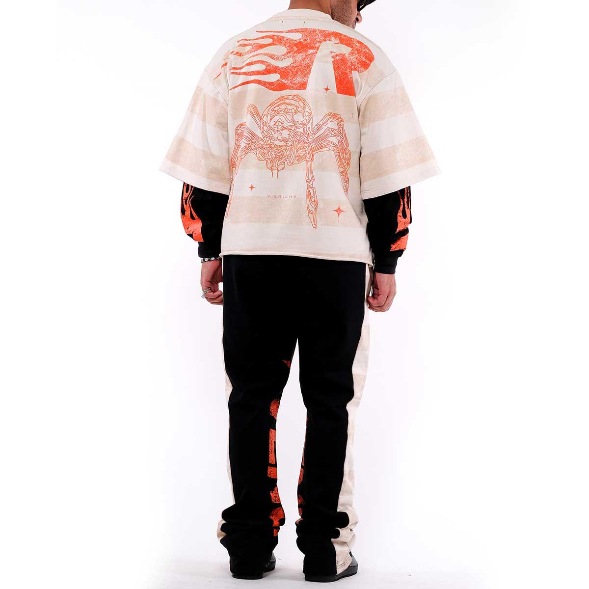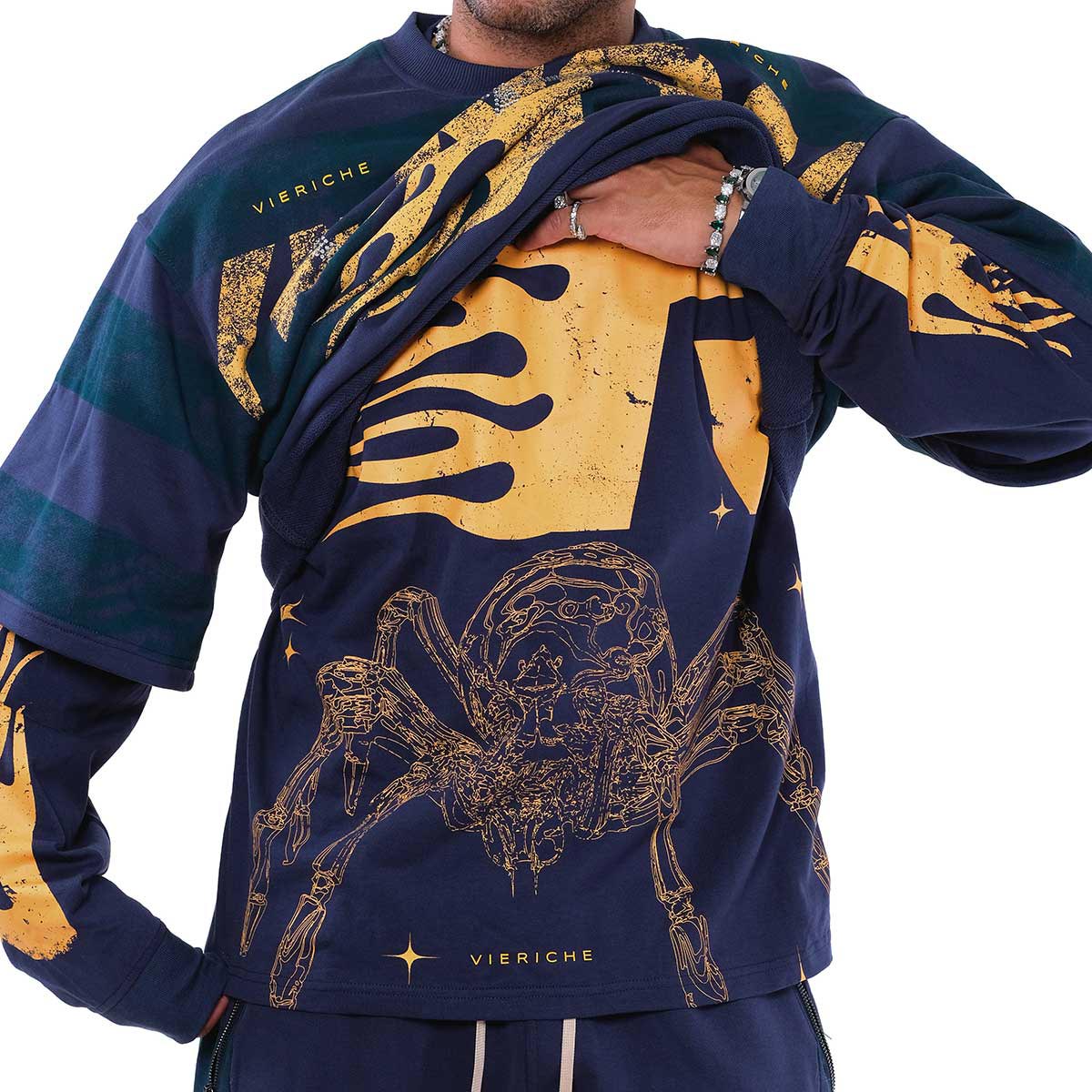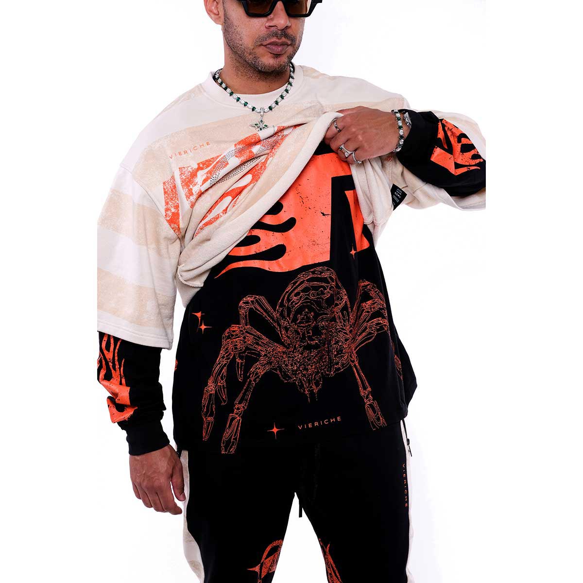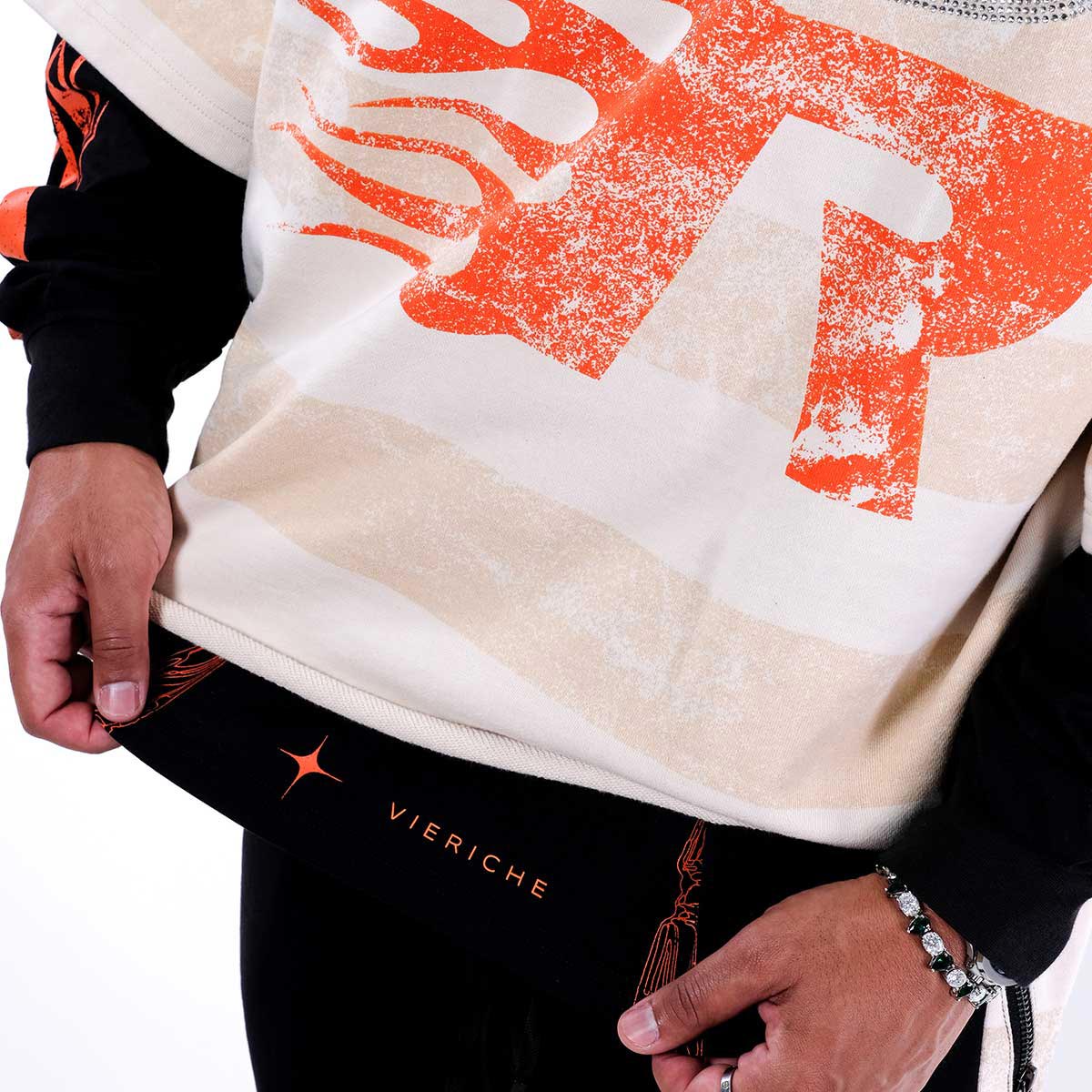 100% Heavyweight cotton french terry layered sweatshirt (2 in 1) with printed stripes, printed graphics, rhinestone application on chest, and a removable long sleeve cotton jersey tee shirt with printed graphics underneath.