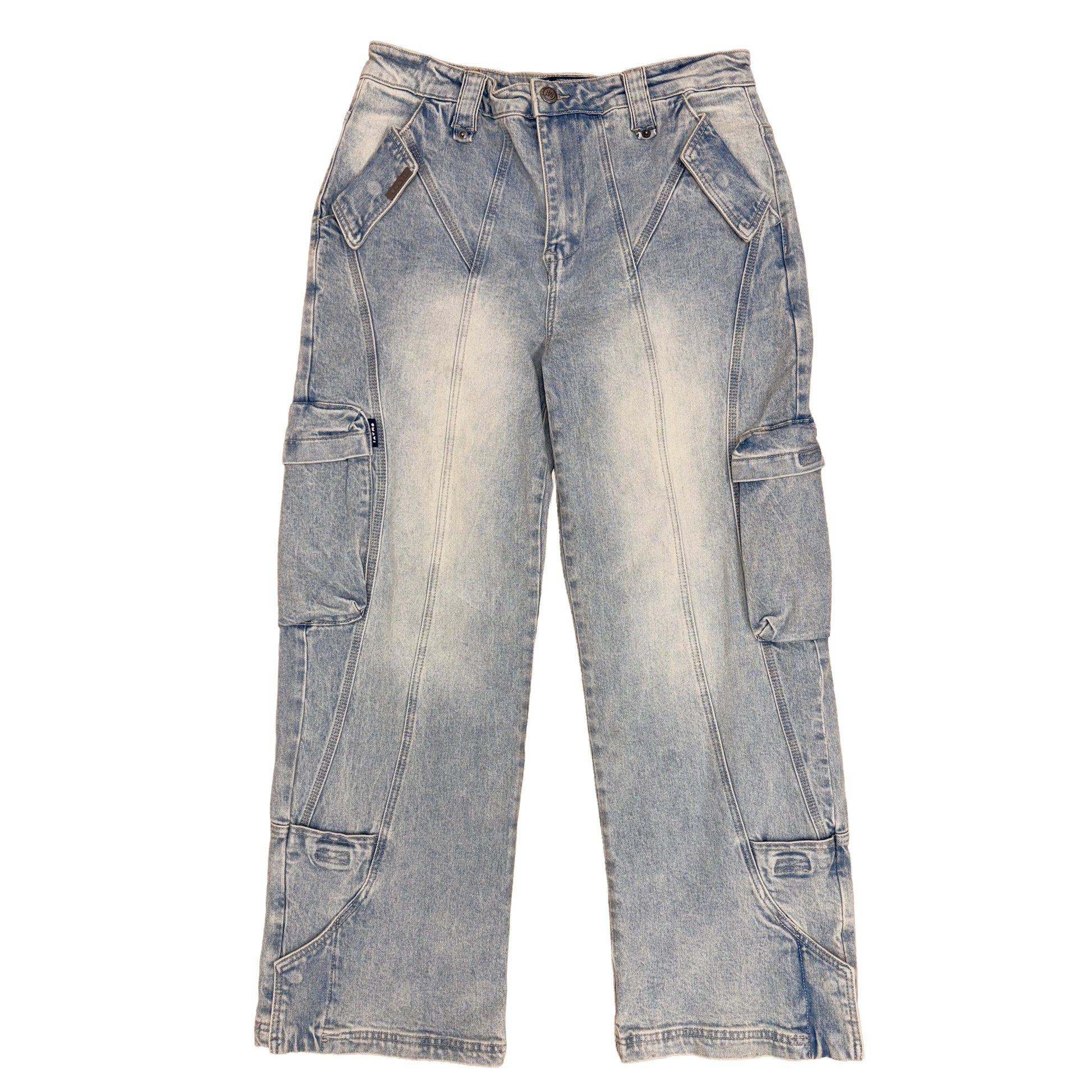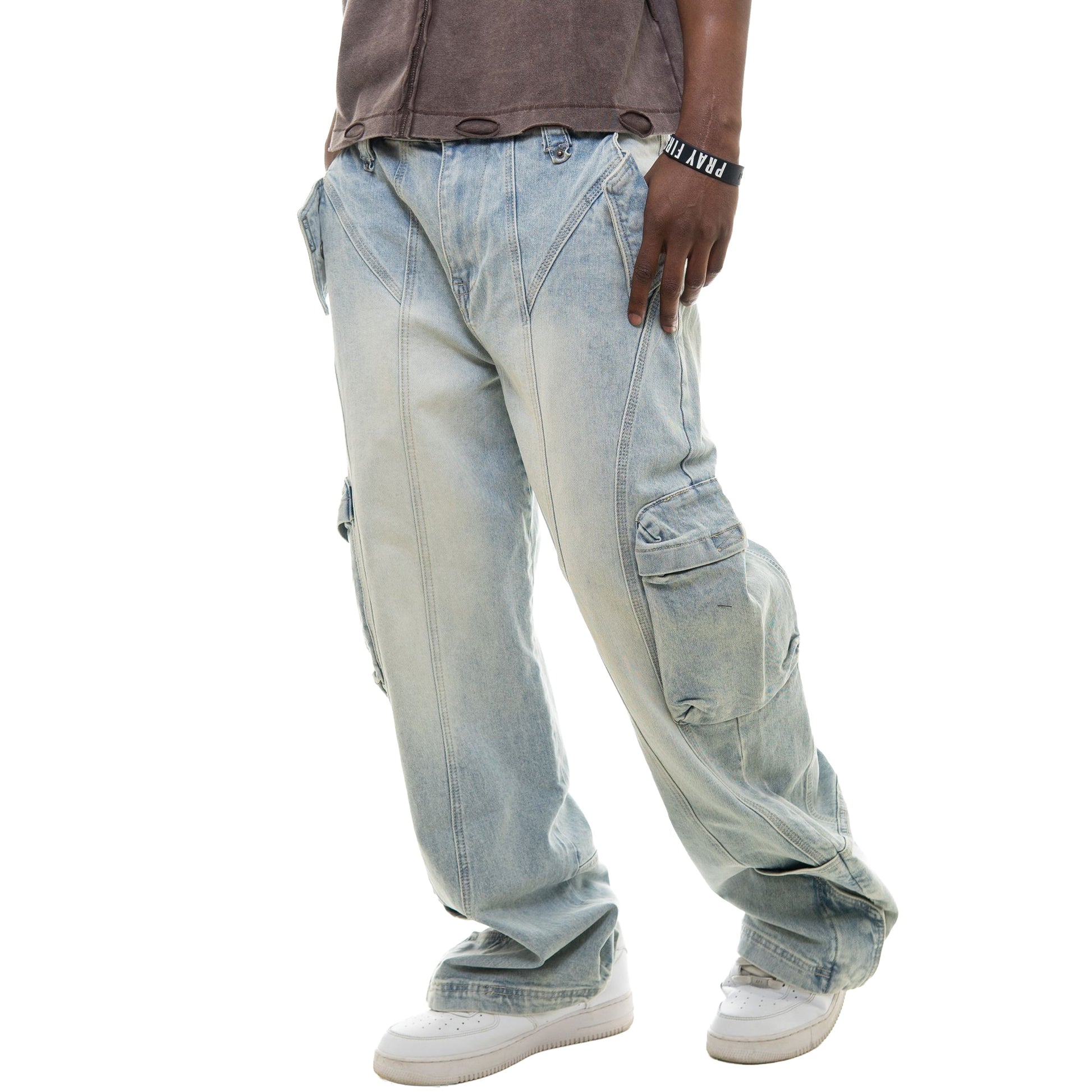 Elevate your everyday rotation with these baggy, multi-pocket denim cargos, designed for those who value both utility and a bold silhouette. Crafted from a heavy-wash denim with distinctive fading, these jeans feature a relaxed, wide-leg fit that stacks perfectly over sneakers.
