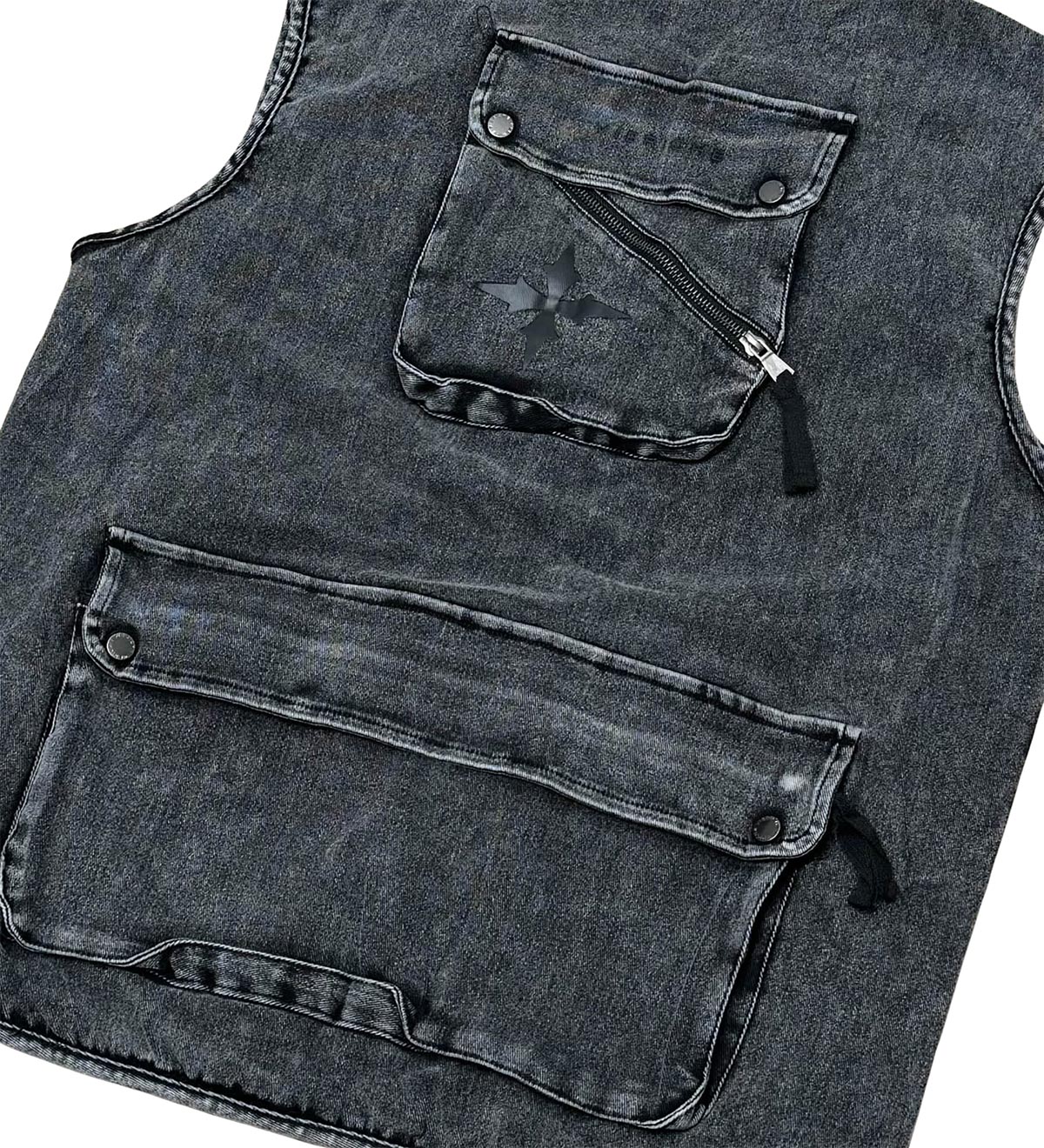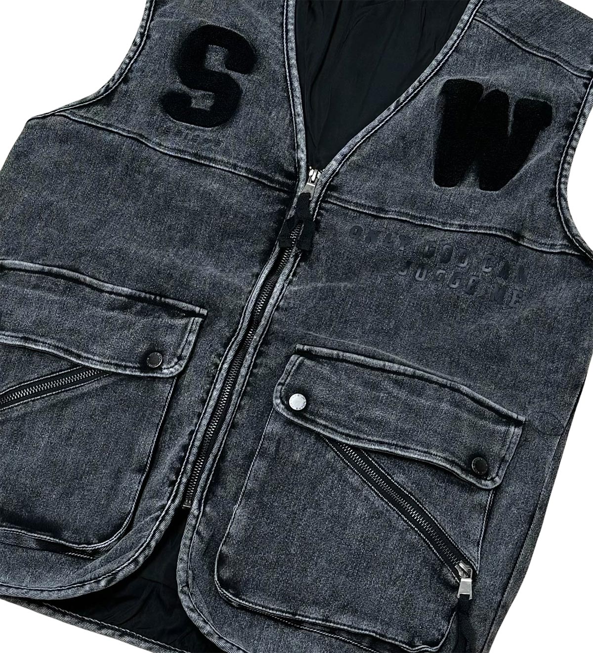 100% cotton canvas vest with patch pockets with zippers, printed insignia on front and back, and chenille embroidery application on front chest.