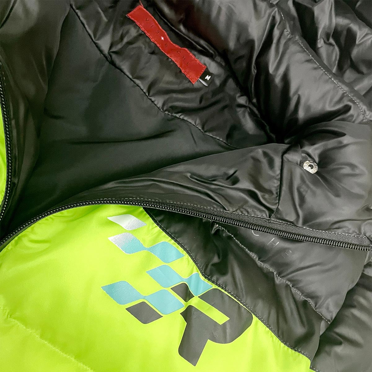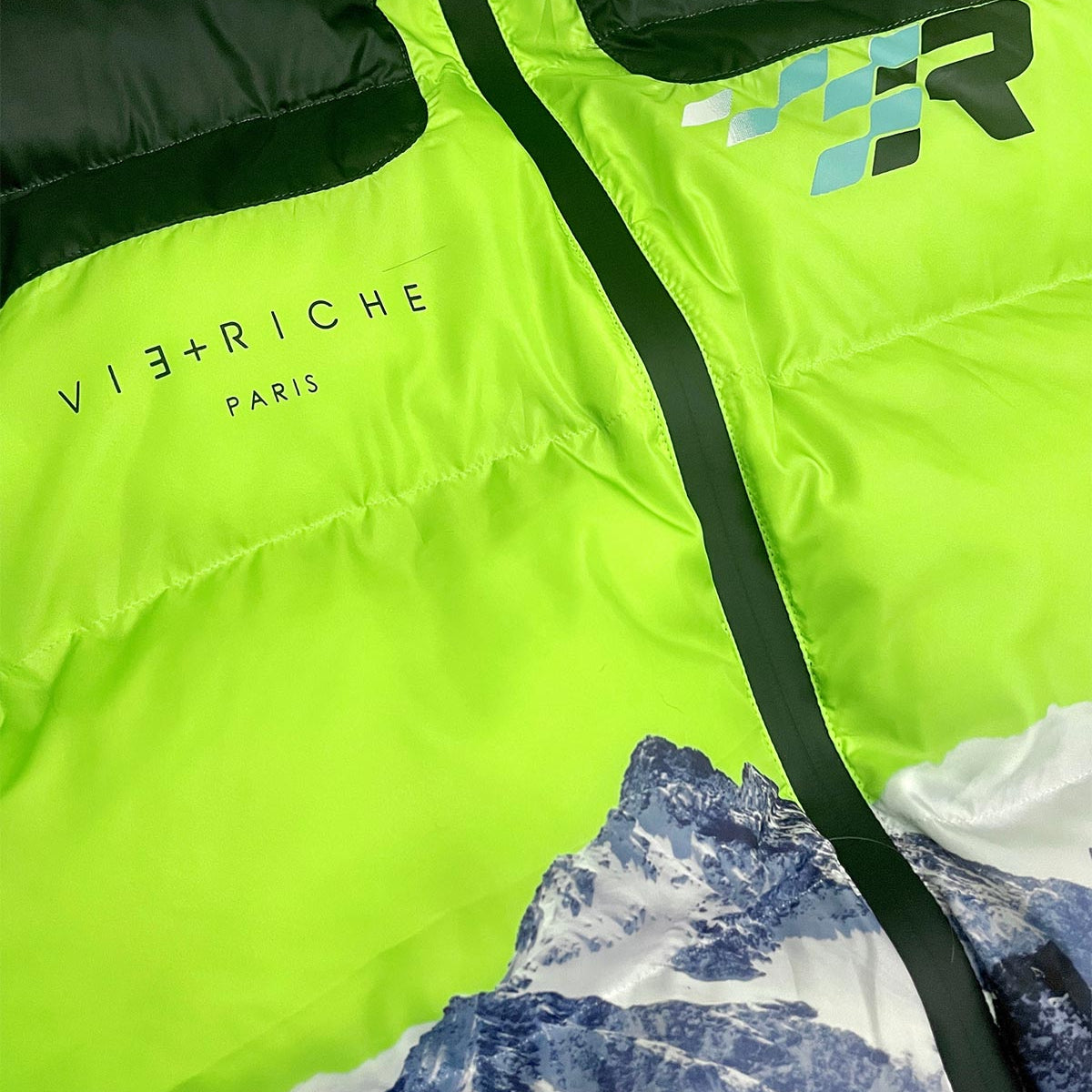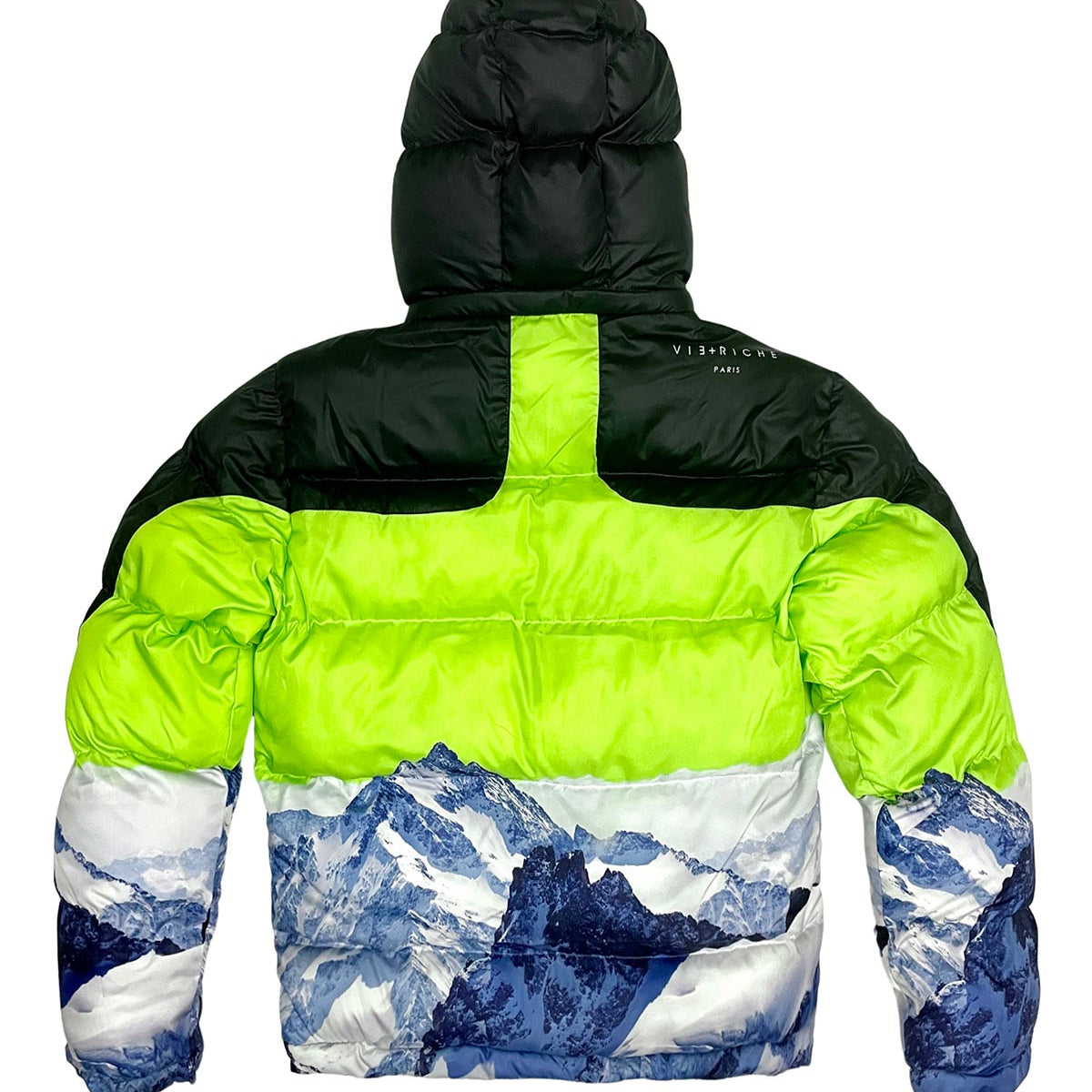Cire nylon puffer coat with water-sealed zippers, contrast color paneling details, printed moutain artwork on front, back and sleeves and faux down filled insulation.