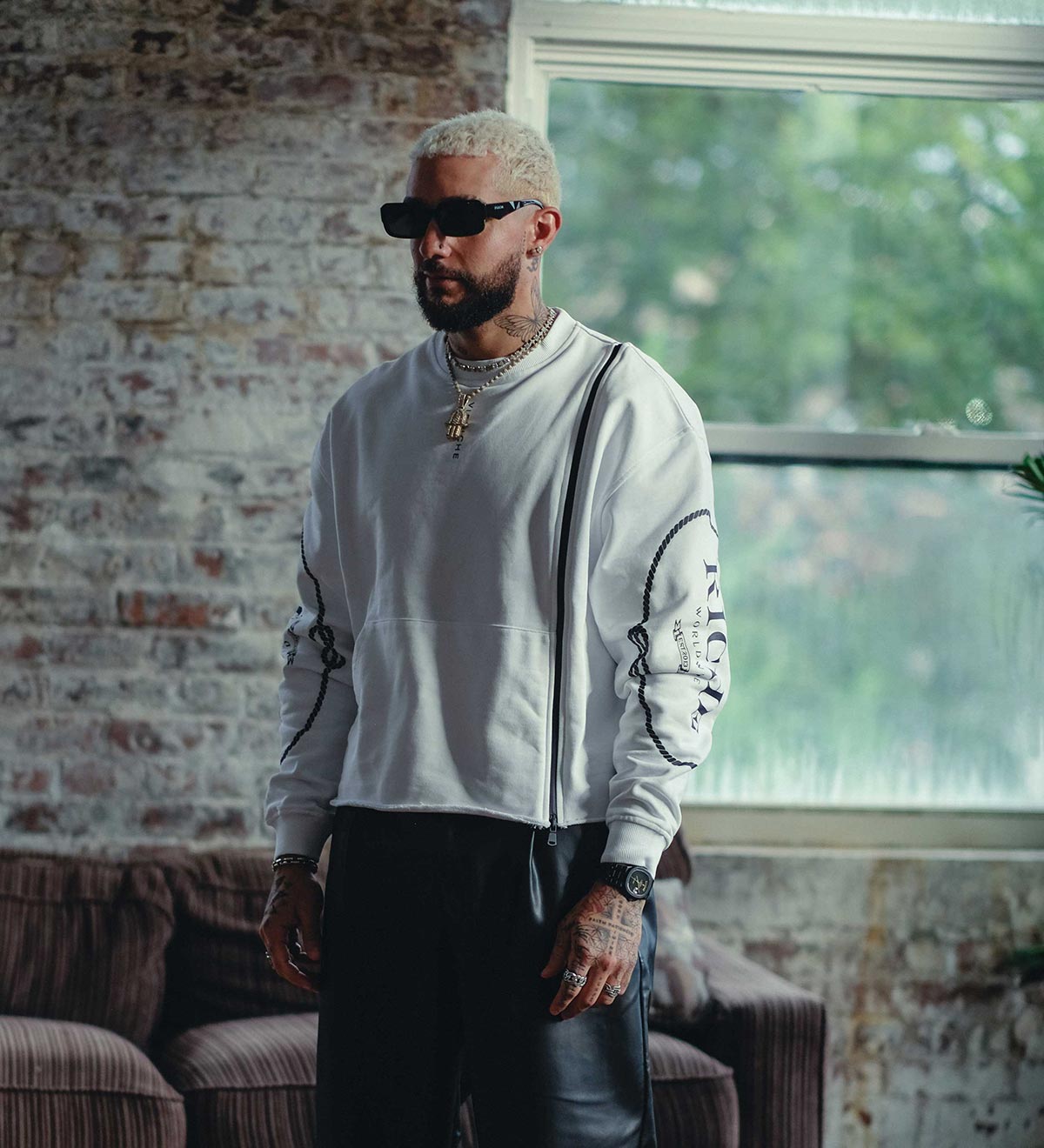 Heavyweight 100% cotton french terry sweatshirt, featuring our staple crop fit, prints on front back and sleeves, and a full zip feature to remove one side and pair it with another color way to create additional color blocked pieces.