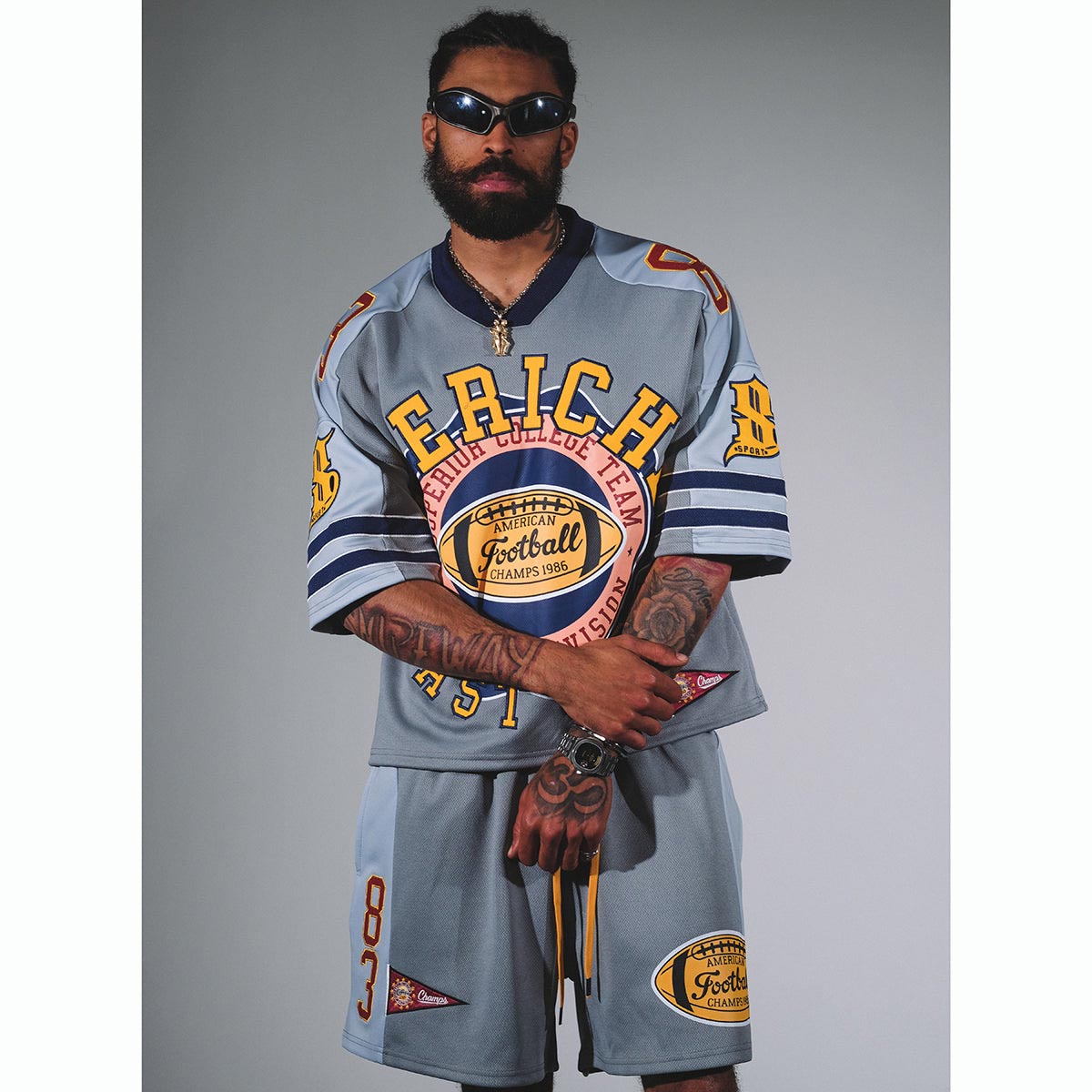 Heavyweight poly jersey and mesh crop football jersey with overlayed patches and printed graphics.