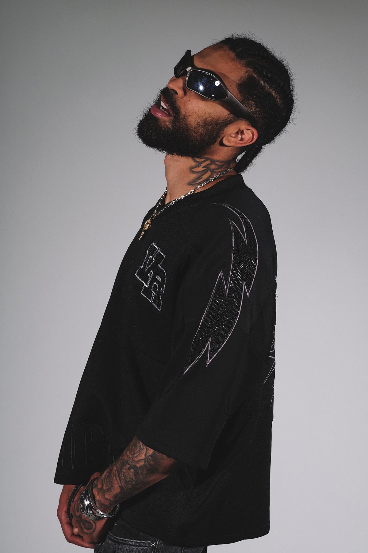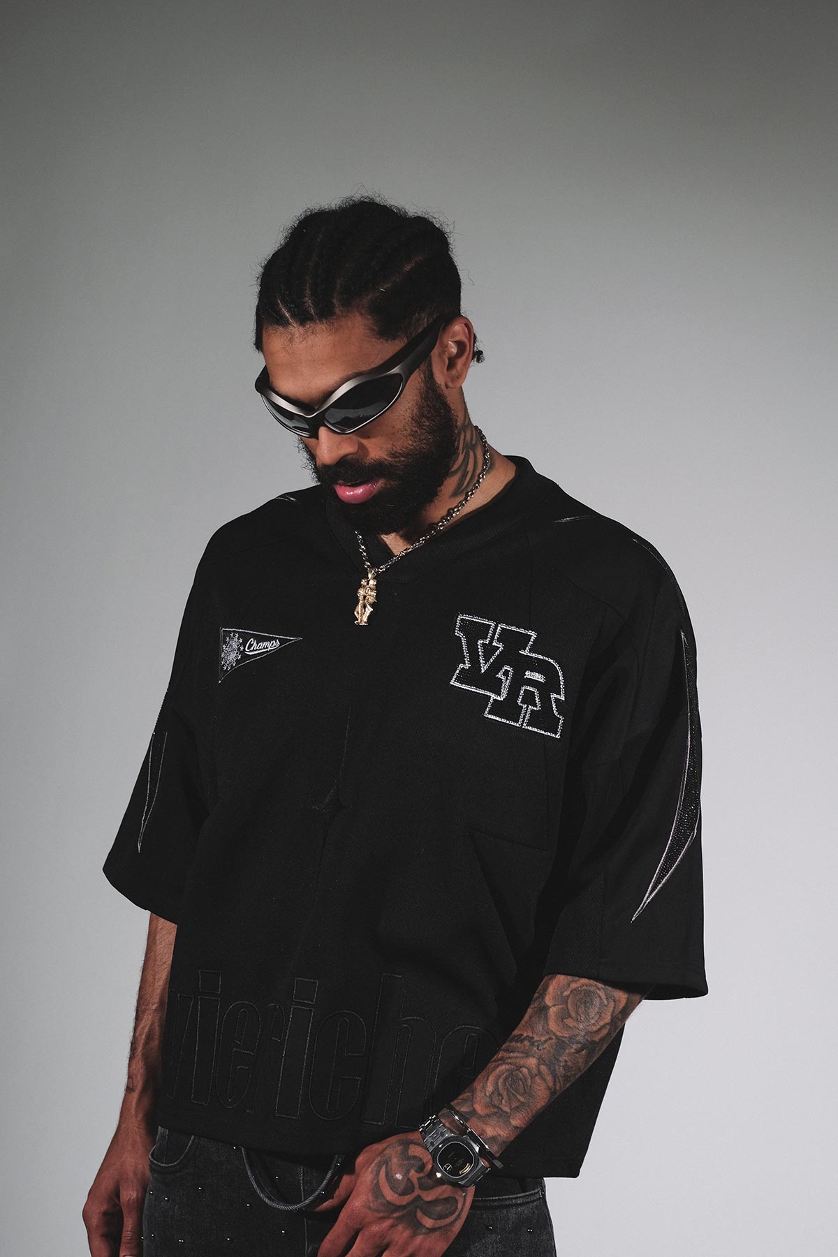 Heavyweight poly jersey and mesh crop football jersey with overlayed patches and printed graphics.