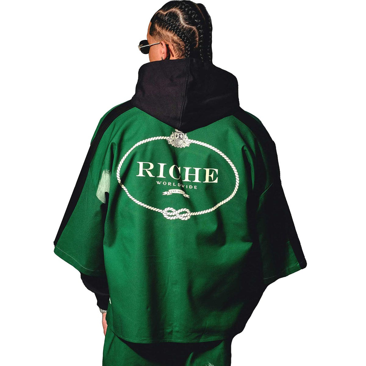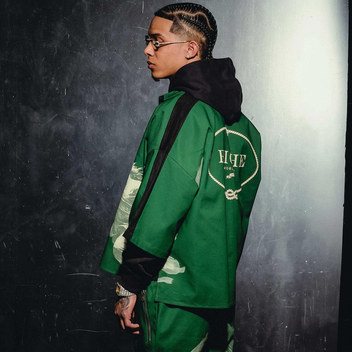 2-piece style. feating a mid-weight 100% cotton french terry hooded sweatshirt with prints on front back and sleeves, as well as a poly-twill woven shirt with prints on front and back.