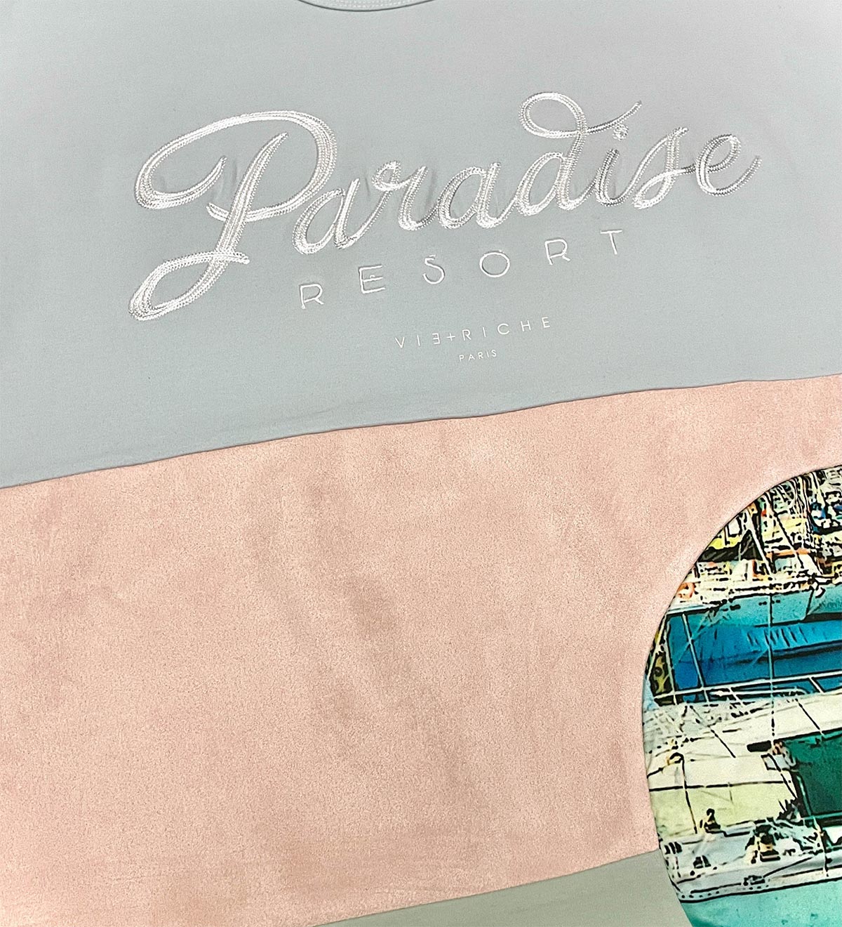 Multi colored and multi-fabric tee shirt blending heavyweight jersey cotton, microfiber suede and poly-satin, with embroidery at the chest, printed panel at left front and rubber patch on back.